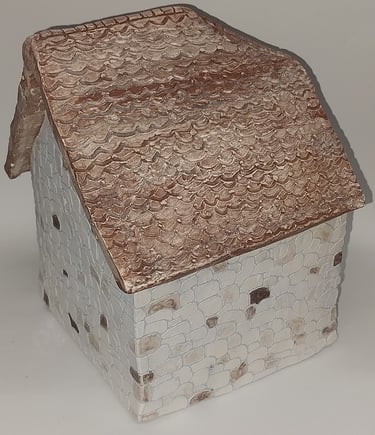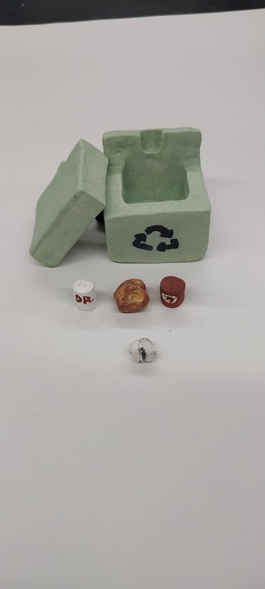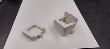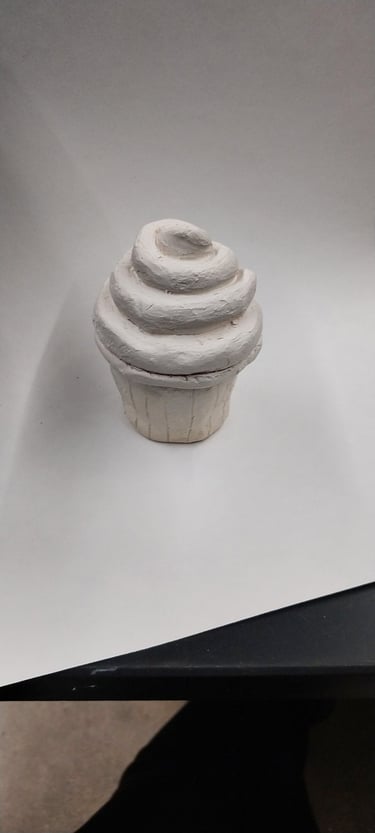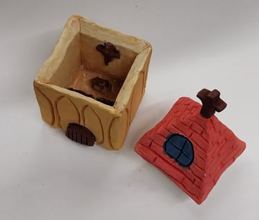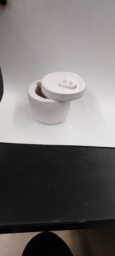 Students practice working with clay by creating a 2x2x2 box. They roll out clay slabs and cut out six 2x2 squares. They then bevel each side of the six squares, slip and score with the serrated rib, and assemble the box, burnishing the constructed box, making the edges crisp. They were then instructed to deconstruct the box and create it into whatever they wanted, and have it include a lid.