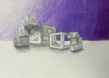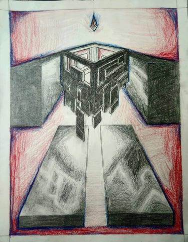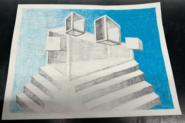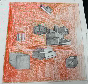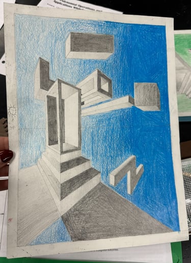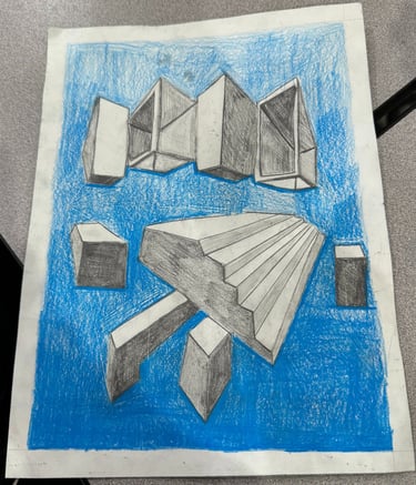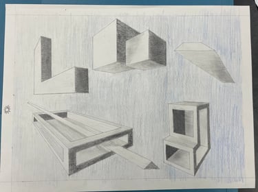 Students built upon prior understanding and applied the concepts of 1-point and 2-point perspectives in this assignment. They created a composition of 7 boxes, including specific requirements for shapes and windows in both 1 pt. and 2 pt. perspective and also demonstrated the ability to blend shadows smoothly using drawing techniques.