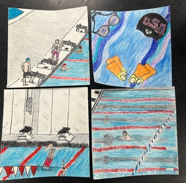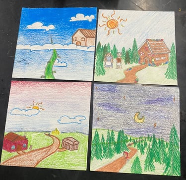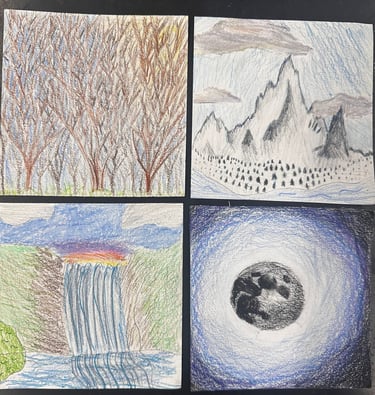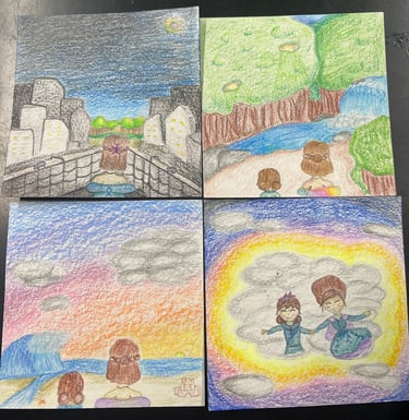 Students completed brainstorming, and thumbnail sketches to create an exceptionally creative project. They showcased unique and imaginative scenes from magical places by using the elements of art and principles of design. The class effectively incorporated a variety of art elements and design principles in their drawn scenes, demonstrating a deep understanding of how to use them to create visual interest and convey meaning. Shown here are the 4 panels for each project that made up the "infinity book" which they constructed after they were finished with coloring. They then completed a final written assignment listing and showcasing how they used each element and principle in their story book.